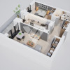 Locuința este amplasată la etajul 3 al unui imobil modern cu șase niveluri, dotat cu lift, având orientare însorită și o suprafață utilă de 51.56 mp, la care se adaugă un balcon generos de 8.90 mp. Compartimentarea este următoarea: