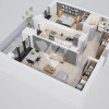 Locuința este amplasată la etajul 4 al unui imobil modern cu șase niveluri, dotat cu lift, având orientare însorită și o suprafață utilă de 51.56 mp, la care se adaugă un balcon generos de 8,90 mp. Compartimentarea este următoarea: