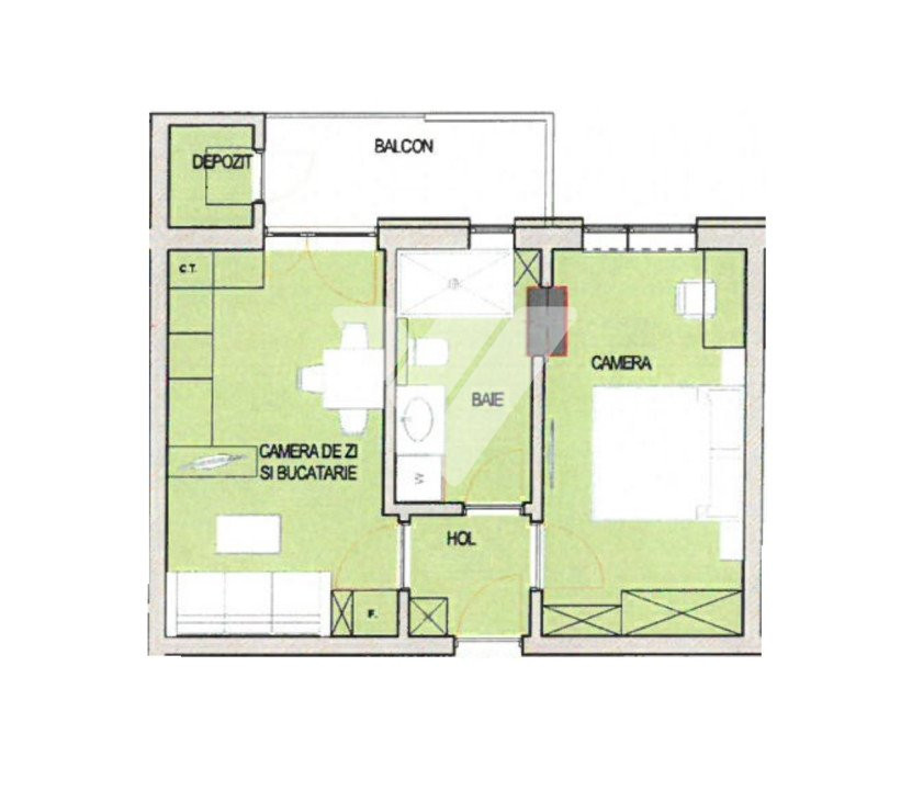 - Hol de acces, living cu bucatarie tip openspace, dormitor, baie cu geam, balcon si un spatiu pentru depozitare izolat termic si inchis cu usa termopan