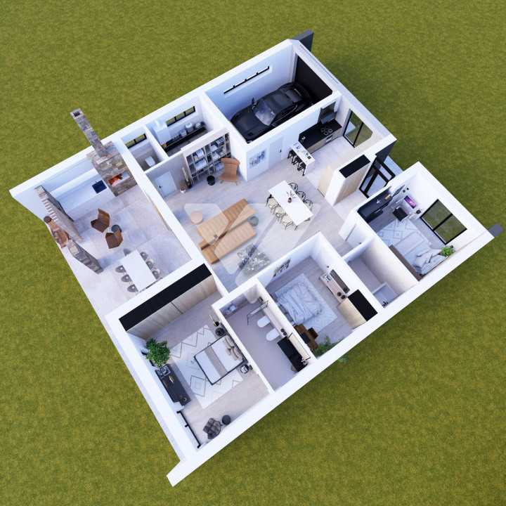 Compartimentarea include un living spațios, bucătărie, trei dormitoare, trei băi, spațiu tehnic și o terasă acoperită generoasă, perfectă pentru relaxare. Proprietatea beneficiază de curte și grădină privată, două locuri de parcare și garaj.