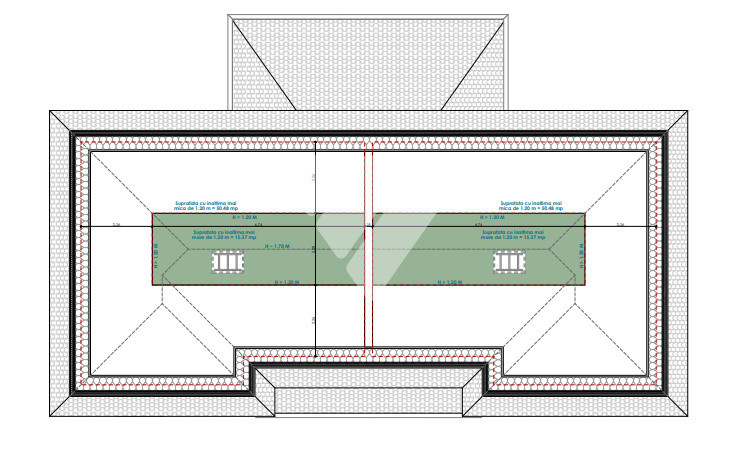 - Acoperiș tip șarpantă din lemn, țiglă ceramică gri;