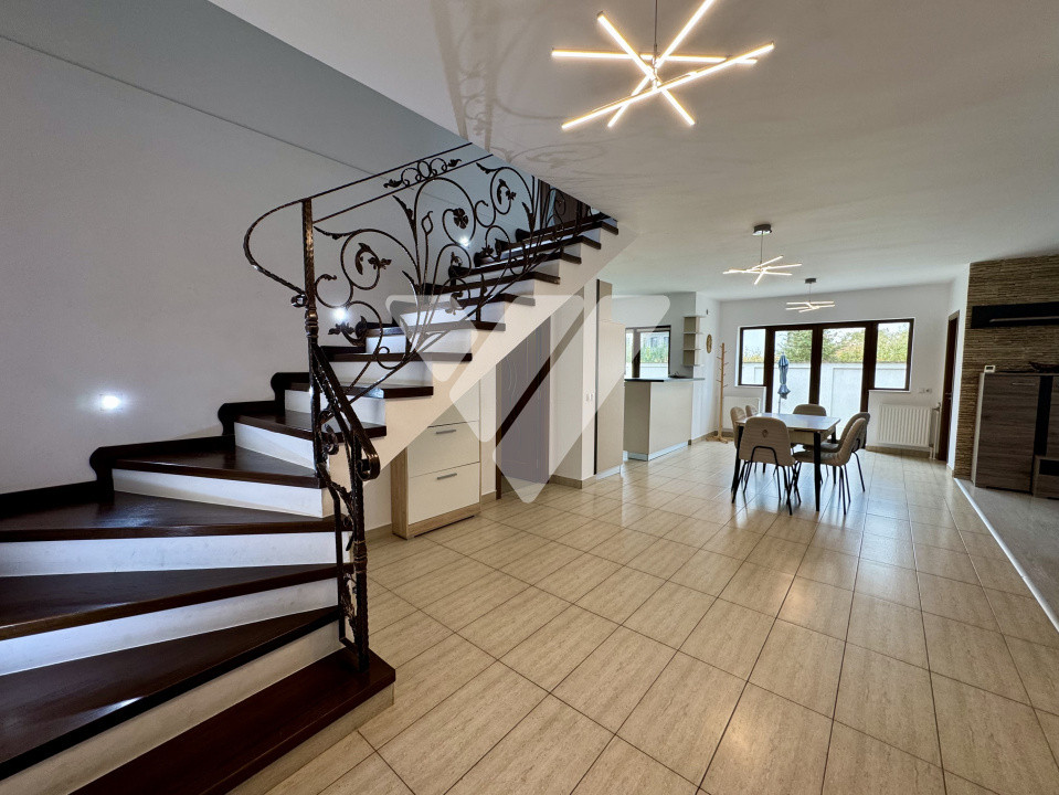 Va propunem spre inchiriere o casa spatioasa complet mobilata si utilata cu 5 camere in suprafata de 150 mp utili si teren aferent de 500 mp aflata intr-o zona exclusiva de case noi din Selimbar reper Hotel Dracula.