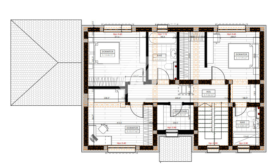 - Acoperiș tip șarpantă din lemn, țiglă ceramică gri;