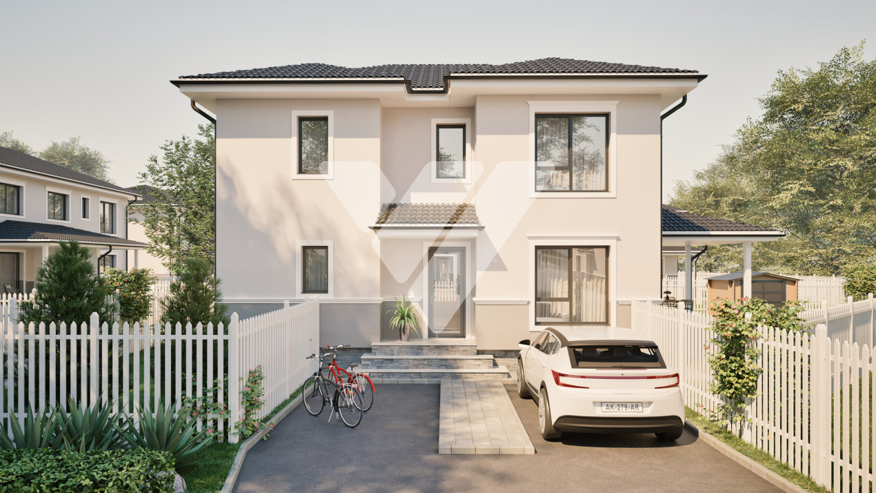 - Exterior la cheie – fațadă cu tencuială decorativă, gard alb stil american, alei și trotuare pavate;