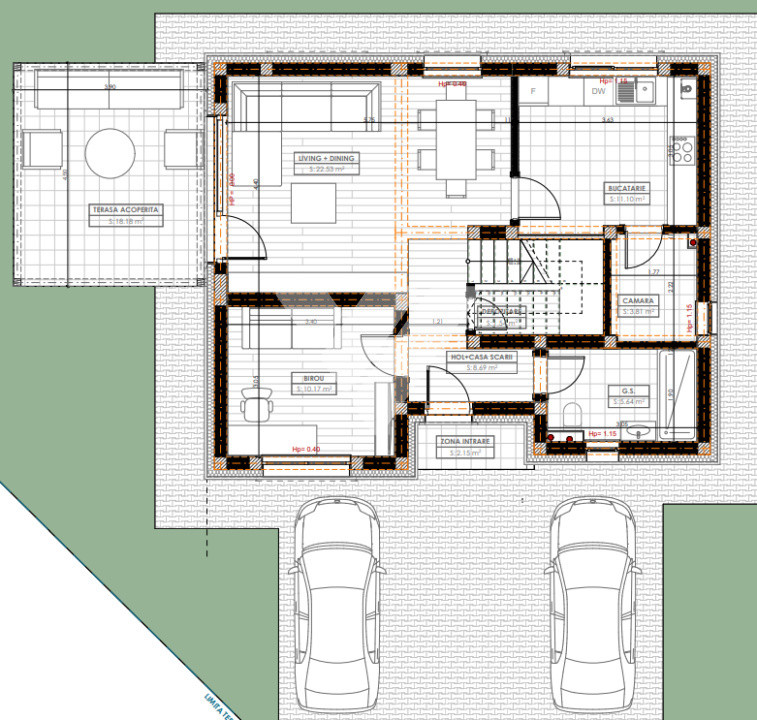 - Terasă acoperită; glafuri exterioare; contoare montate la limita de proprietate.