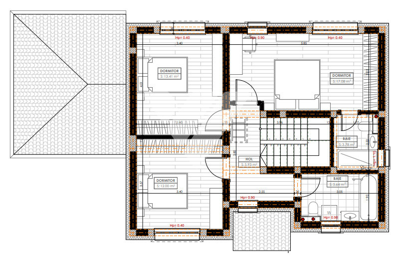 - Acoperiș tip șarpantă din lemn, țiglă ceramică gri;